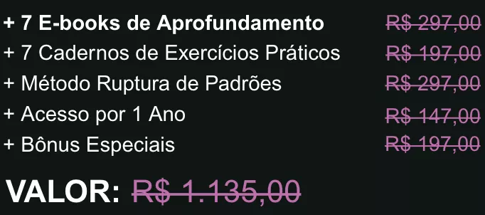 As 7 semanas são de aprendizado e compreensão biográfica. No final, você cria seu Plano para quebrar 1 padrão reconhecido. Então, na verdade, o curso não termina nas 7 semanas... ele se estende pelos 90 dias seguintes de ação prática. E você pode refazer o processo quantas vezes quiser com outros padrões. O acesso fica liberado por 1 ano para você revisitar os materiais sempre que precisar.